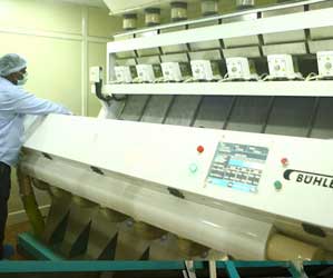 RE-PROCESSING UNIT The state of the art reprocessing plant of AS Rice Mill uses 21st century technology from Buhler and China. The online inflow and outilow mechanisms are fully computerized with the help of sensors. The plants have production capacity exceeding 52 metric ton per hour. Adding up the total production of our mill is about 1250 metric ton per day. The firm is equipped with a number of pre-cleaners, de-stoners, precision sizers, graders, paddy separators, de-huskers, magnets etc. The plant premises are environment friendly and fully protected against contamination by foreign particles and covers total land of 4,00,000 square feet. A series of color sorters and multi sorters are installed at AS Rice mill. When the rice is passed through the series of sorting machines, it gets free from glass pieces, plastic, granules, foreign material, dust, damaged, discolored and unwanted grain.